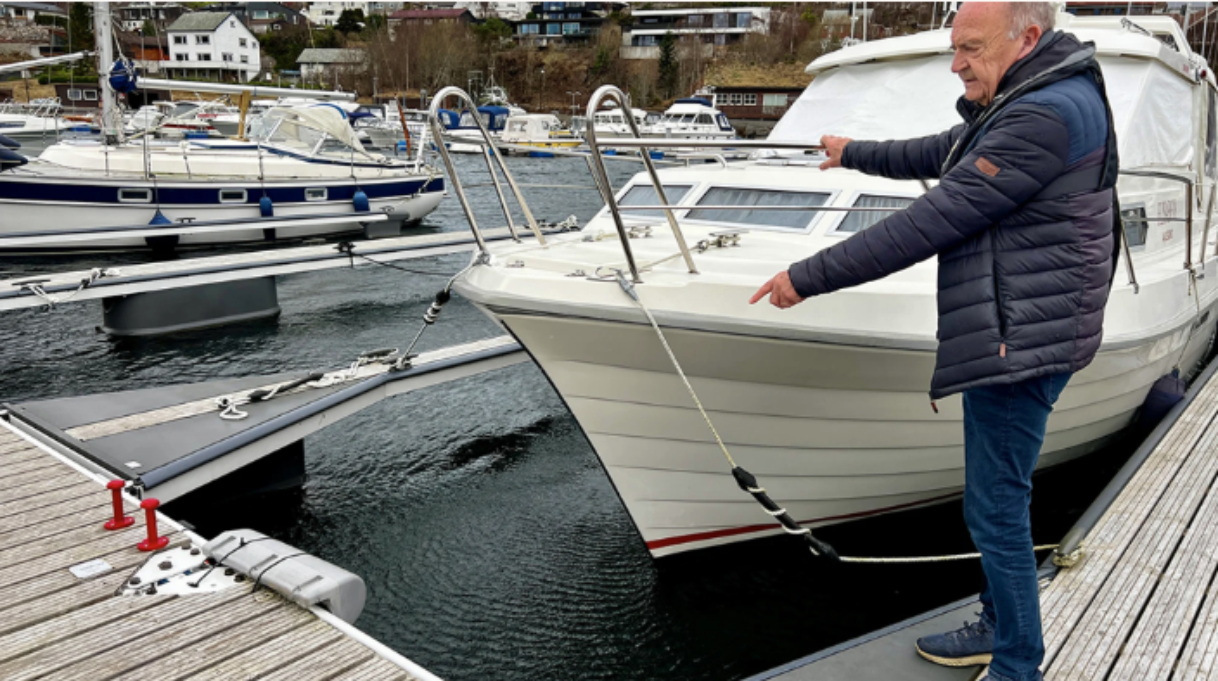 Han fikk øye på entringstauet som småbåtforeningen satte opp tidligere, og visste at det var en leider (stige) på den andre siden av båten sin.